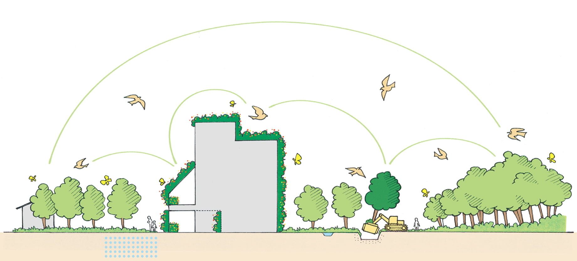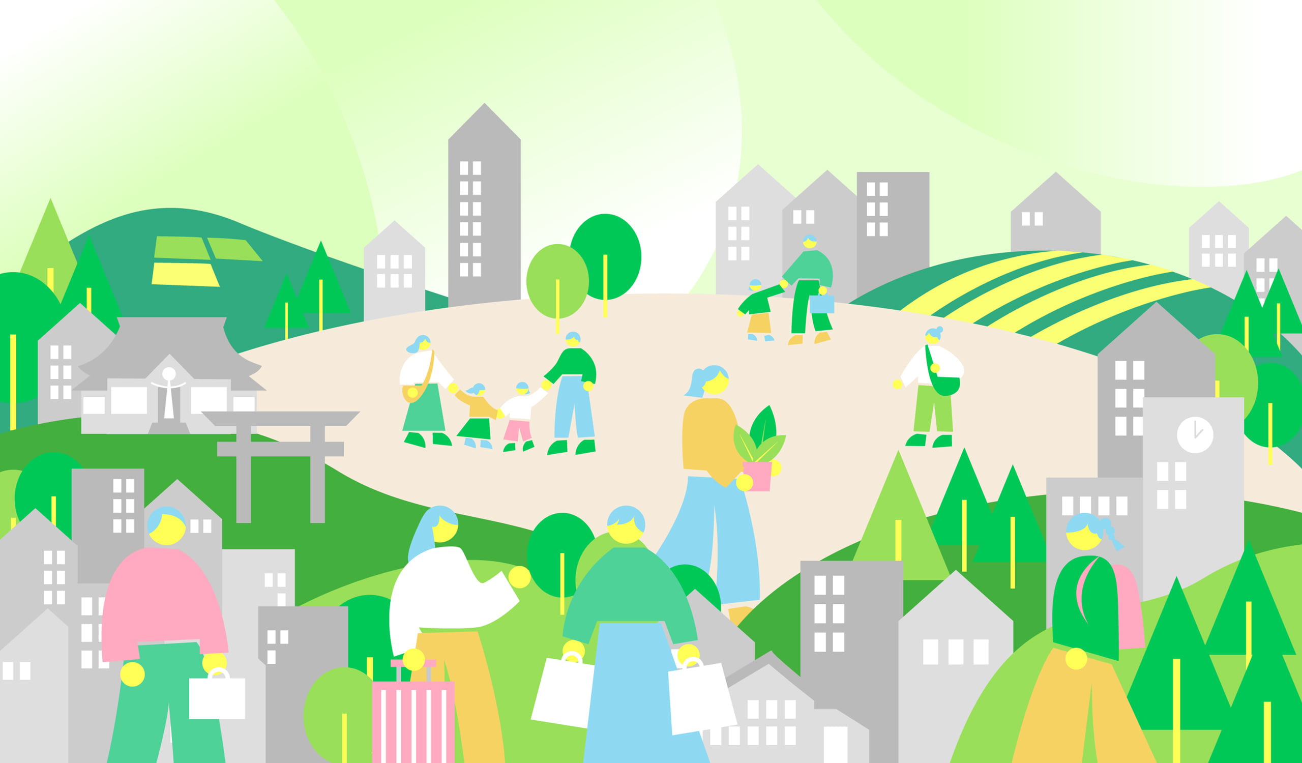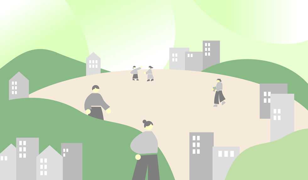 私たちは、自然環境だけでなく、生活環境も含めたウェルビーイングを実現するために、事業領域の幅をさらに広げ、これまで培ってきた技術力と提案力を「環境緑化サービス」へと高めていきます。自然が有する多面的効果をさまざまな社会課題の解決に活用するグリーンインフラの普及と実践を通じて、豊かな未来づくりに取り組みます。